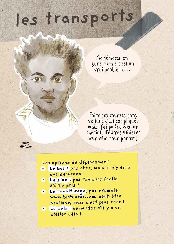 Pour répondre aux deux besoins principaux identifiés sur le terrain (faire émerger un sentiment d'appartenance, et activer différentes capacités d'adaptation), nous avons créé le livret “On est passé par là!”. Il prend le format d’un carnet de voyage, qui mélange témoignages et conseils, photos et prises de notes personnelles.